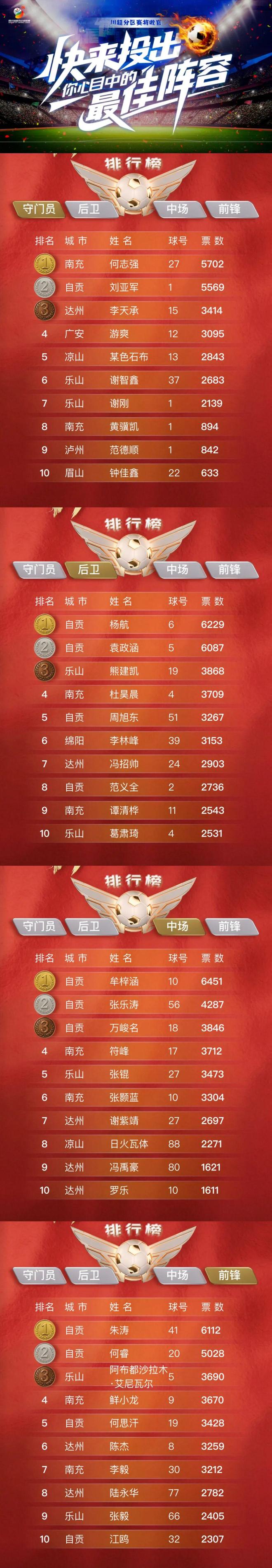 川超联赛的分区赛已经接近尾声,晋级的状况也慢慢明朗起来。奥州已经提前预定了位置。达州四川汉子队的队员们用他们的汗水和努力给我们留下了无数激动人心的时刻。目前,“川超赛区最佳球队”投票正在紧锣密鼓地进行中。让我们用您的一票来支持我们家乡的骄傲吧!每个赛区都有闪亮的明星,有提前出线的冠军球队,也有继续奋战的顽强球队。现在,我们热切地等待着您庄严的誓言,以启迪那些处于荣耀中心的人们。投票指南:您认为谁是最稳定的“最后一道防线”门将?后卫 谁是防守的支柱?谁是中场的幕后大脑?前线的凶手是谁?您的选择是关注“标准”中的“大洲发布”官方微信,并回复关键词“斯点击“川中超投票”即可获得为您支持的球员投票的链接。投票日为11月18日下午6点至11月27日下午6点。投票方式:每人每天11票,每11名球员11票,其中门将1名、后卫4名、中场3名、前锋3名。 ・每位球员每天只能投票一次,・最终阵容将根据公众投票结果确定,最终阵容将由公众投票结果确定,每一次评选都是一场精彩比赛的集合,让我们在这激动人心的旅程中留下最公正的注脚。让更多人看到大树队球员的态度和大树球迷的团结 来源:天府新视野、大洲首发。特别提示:以上内容(包括图片、视频,如有)由自有媒体平台“网易账号”用户上传发布。本平台仅提供信息存储服务。我会提供给你。